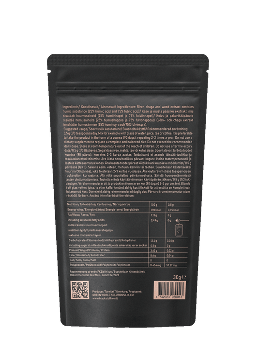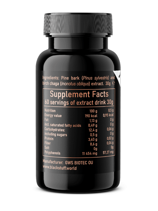 Black Stuff is a composition rich in fulvic and humic acids, derived from pine bark and birch chaga. It boasts a notably high polyphenol content, making it a standalone 100% soluble prebiotic.